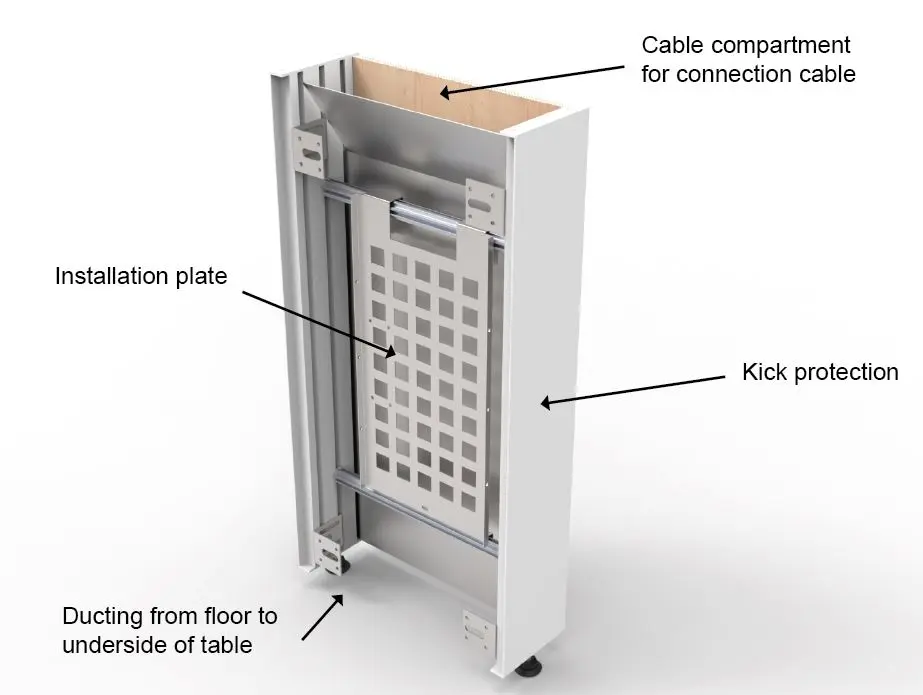 Bakom installationsplåten finns ett särskilt utrymme för kablar där de bara kan röra sig i två riktningar: upp och ner. Därför trasslar de aldrig. Användaren drar enkelt fram den längd som behövs via genomföringen i bordsskivan och trycker tillbaka kabeln när mötet är slut. Och viktigast av allt – under bordet finns inga lösa kablar eller kontakter att sparka runt på. Allt ligger skyddat, organiserat och dolt i stubben.